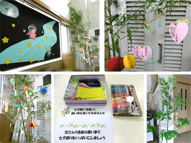 みなさん、短冊に願い事を書いて、笹に飾ってくださいね!